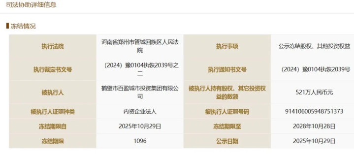 据国度企业信用信息公示系统表露,百盈城投集团所握河南垂天科技有限公司521万元股权被国法冻结,冻结期限为2025年10月29日至2028年10月28日,奉行法院为河南省郑州市管城回族区东谈主民法院;百盈城投集团所握深兰东谈主工智能科技(上海)股份有限公司151.082万元股权被国法冻结,冻结期限为2025年8月29日至2028年8月28日,奉行法院为郑州管城回族区法院。