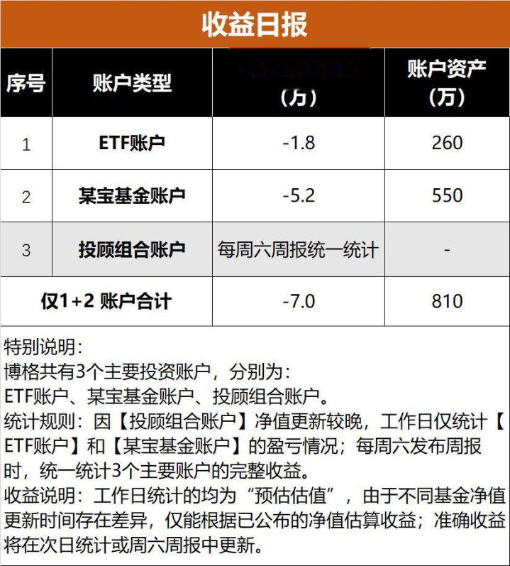 (3)两个账户,忖度预亏本-7.0万,预估盈亏比例-0.86%。