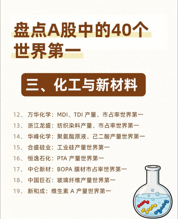 今天这8家A股化工企业,每一个齐是细分赛说念的寰宇冠军,从MDI到玻璃纤维,从纺织染猜想维生素,撑起了人人制造业的半壁山河,看完你就懂,什么叫信得过的“中国制造”!