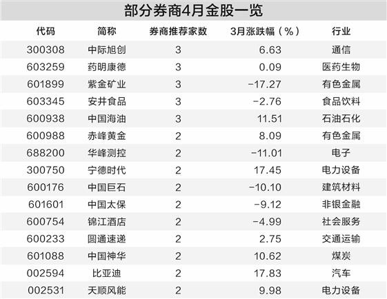 据证券时报·数据宝统计,抑制3月31日收盘,已有14家券商发布4月金股,筹算98只金股上榜。从行业散布来看,4月金股笼罩中电力竖立行业个股数目最多,共计9只,电子、机械竖立、基础化工、通讯、有色金属5个行业均为6只。15股获2家及以上券商推选,中国海油、中际旭创、药明康德、安井食物、紫金矿业5股赢得3家券商推选。