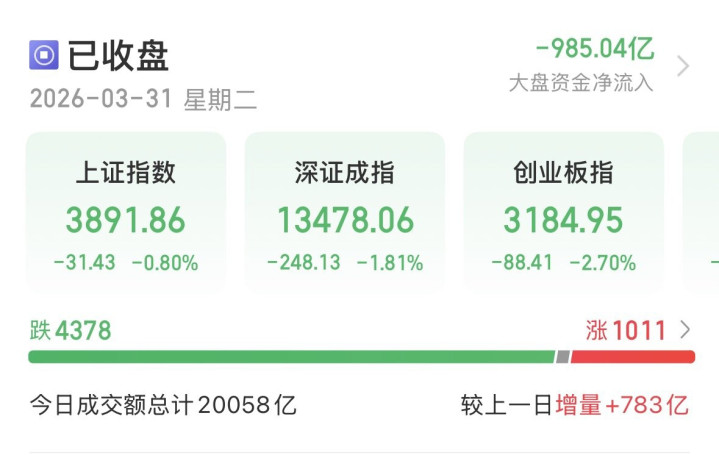 3月31日,A股三大指数集体回调。范畴收盘,沪指跌0.80%,收报3891.86点;深证成指跌1.81%,收报13478.06点;创业板指跌2.70%,收报3184.95点。全阛阓成交额20058亿,较昨日放量783亿。个股亏钱效应显耀,全阛阓超越4300只个股下落,仅1011只个股飞腾。