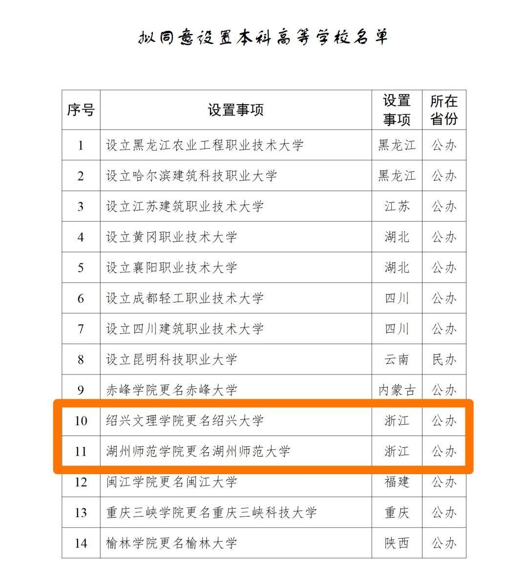 1月12日,教化部官网发布了《对于拟甘愿成就本科高档学校的公示》,拟甘愿成就黑龙江农业工程事业期间大学等14所学校,其中绍兴文理学院改名为绍兴大学、湖州师范学院改名为湖州师范大学。