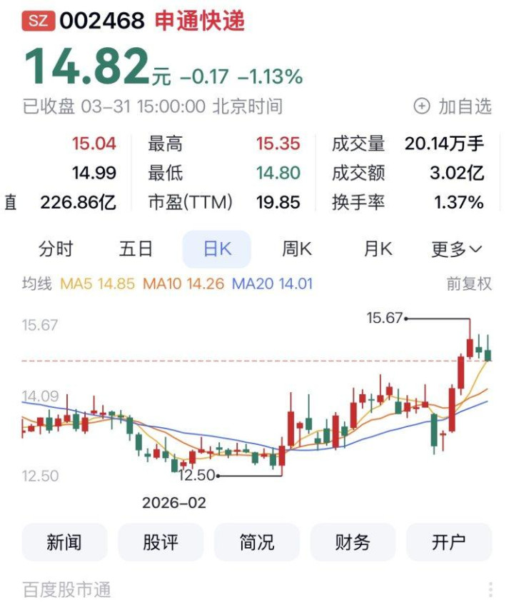 3月31日,申通快递报收14.82元,涨幅为-1.13%,换手率1.37%,转动市盈率19.85,总市值226.86亿元,当月累计涨幅7.39%,本年一季度涨幅10.43%,列快递A股涨幅第二。