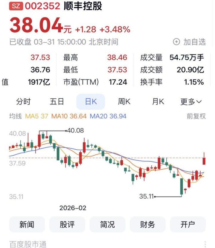 3月31日,顺丰控股报收38.04元,涨3.48%,换手率1.15%,od手机app 转动市盈率17.24,总市值1917亿元,当月累计涨幅0.45%,本年一季度涨幅为-0.73%。