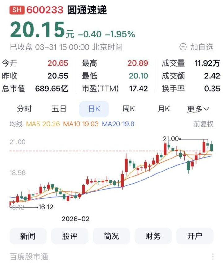 圆通速递3月31日报收20.51元,单日涨幅为-1.95%,本月涨幅为2.75%,换手率0.35%,总市值689.65亿元,转动市盈率17.42,本年一季度涨幅为22.72%,列快递A股涨幅第一。