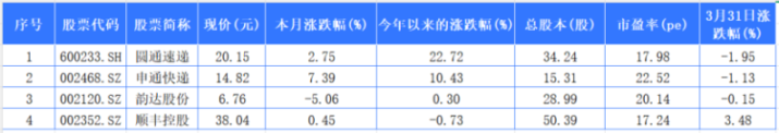 另外,港股的中通快递3月31日报收188.200元港币,3月涨幅为-2%,本年以来涨幅16%。