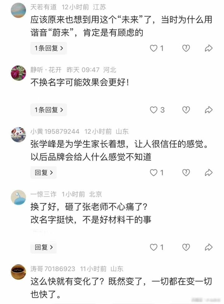 3月中旬,好多东谈主刷手机时发现,“峰学蔚来”的账号不见了,微信、微博、抖音上全换成了“峰学将来”,少许预报齐莫得,寰宇感到困惑,有东谈主揣摸是不是账号被盗了,有东谈主翻看之前的帖子阐述我方莫得记错,推行上这不是俄顷发生的事情,是早就计较好的安排,仅仅到了实行的那天才细密落实。