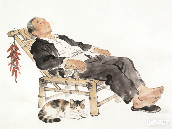 青砖院里,我方歪在竹椅上晒太阳,脚边趴着只花斑猫,连椅背上晒着的辣椒串都画得活天真现。