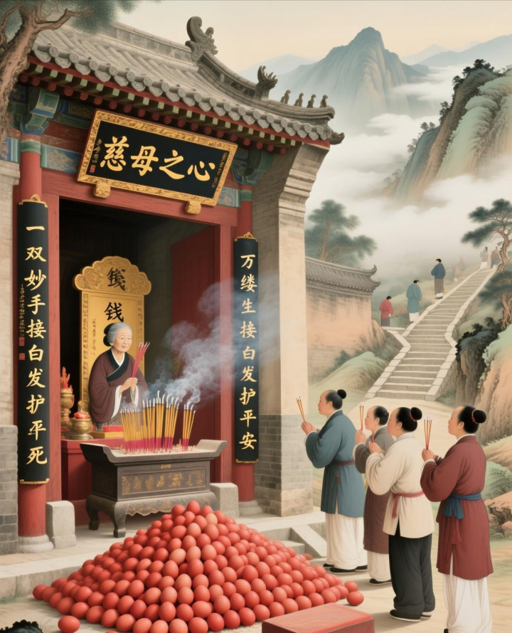 自后,有东说念主在朝狐岭上盖了一座小庙,供着钱婆婆的牌位。那些生了孩子的东说念主家,都会去庙里烧柱香,放几个红鸡蛋,求钱婆婆保佑孩子祥瑞长大。庙里的香火越来越旺,牌位前的红鸡蛋堆成了小山。