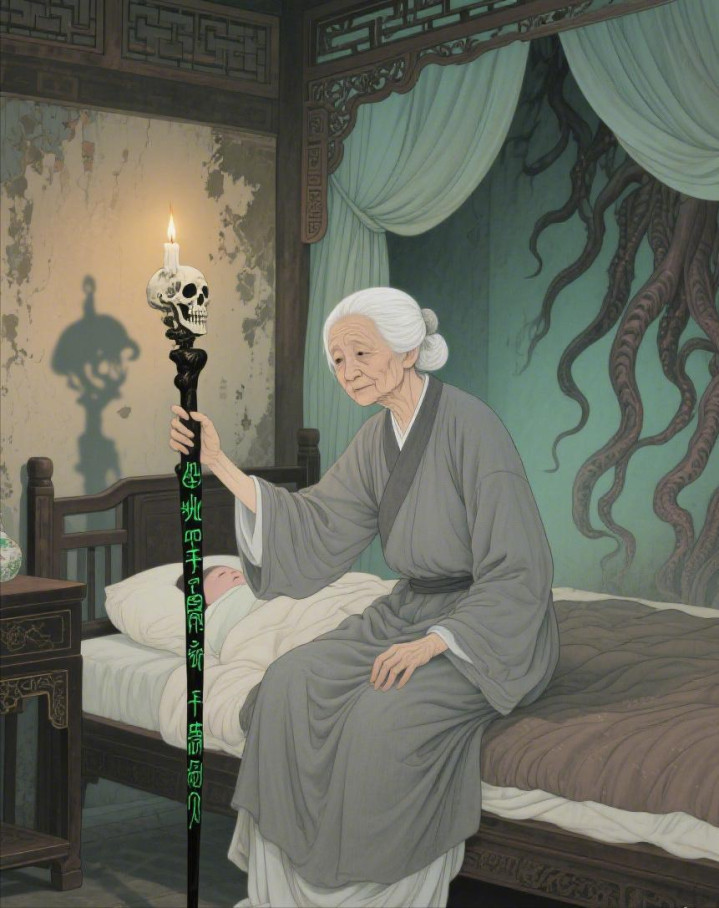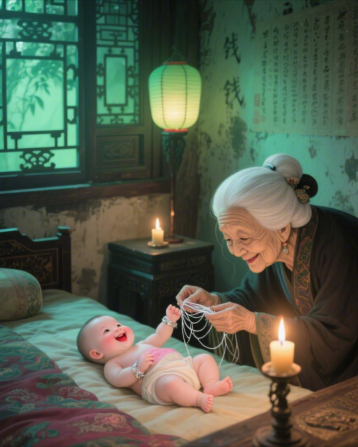 她轻轻把孩子放在床上,重新上拔下终末一根鹤发,系在孩子手腕上,念了终末一遍《地藏经》。那根鹤发细得像蛛丝,在烛光里闪着光。