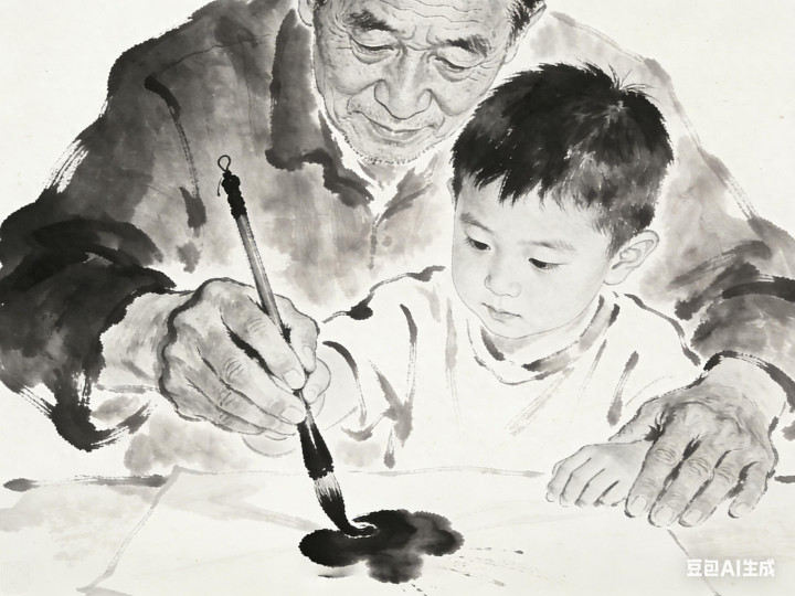 老赵头教孙子抓笔,那双随意的大手包住小手,少量点掰开、扶正。