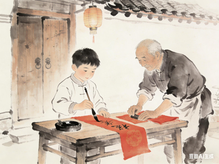 贴春联时,小宇踩在板凳上,老赵头鄙人面扶着,两只手牢牢箍着孙子的腿。