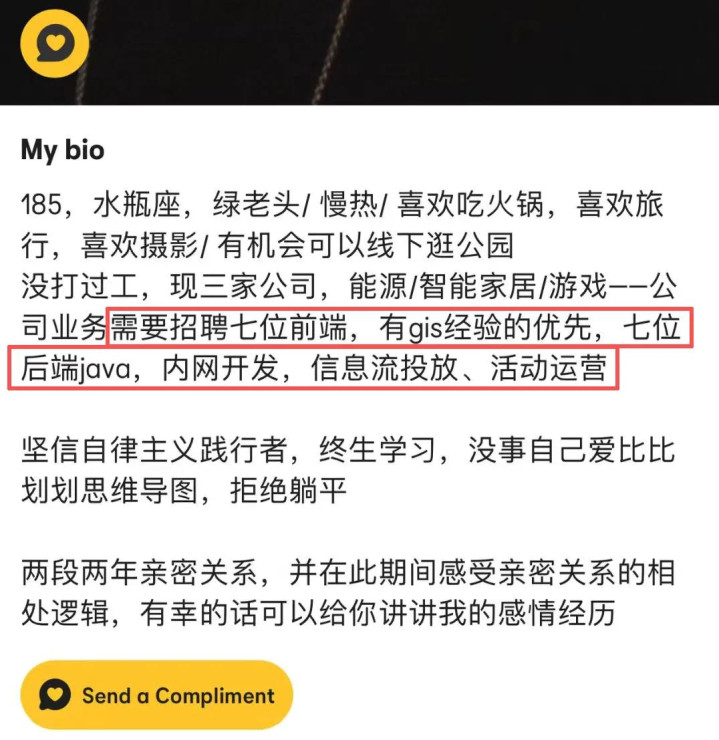 名下有着三家公司的雇主运转在线摇东谈主,在身高、星座、MBTI、意思心疼和过往心情履历的漏洞中,当然融入了前后端、投放和运营的岗亭招聘信息。