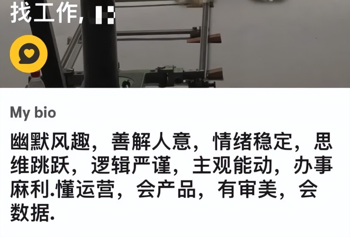 原来用来展显露思心疼、糊口表情和恋爱期待的个东谈主简介,被改写成一份很是精简的求职简历。简浮浅单几句话,专科、手段、职责履历一应俱全,班味重得溢出屏幕。