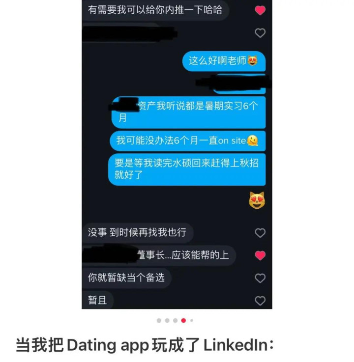 也有学生在简介中亮出“某某公司实习生”的身份,由此诱骗来不少同业或前辈的热诚。在一来一趟的聊天之中,妥洽逐步树立,他致使因此赢得了被引荐的契机。