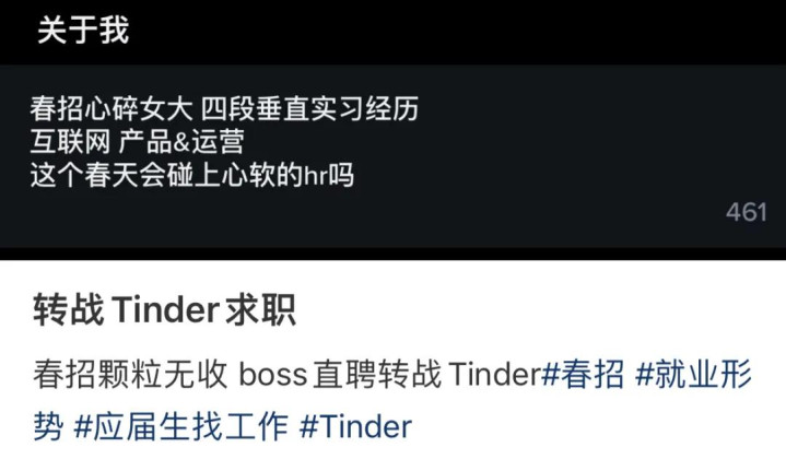 彼此间莫得火花四溅的糊涂试探,只消高度一致的个东谈主简介:“春招心碎大学生,在线找职责。”