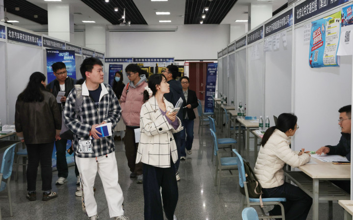 高校学子在了解用东说念主单元的招聘信息。北京市东说念主社局供图