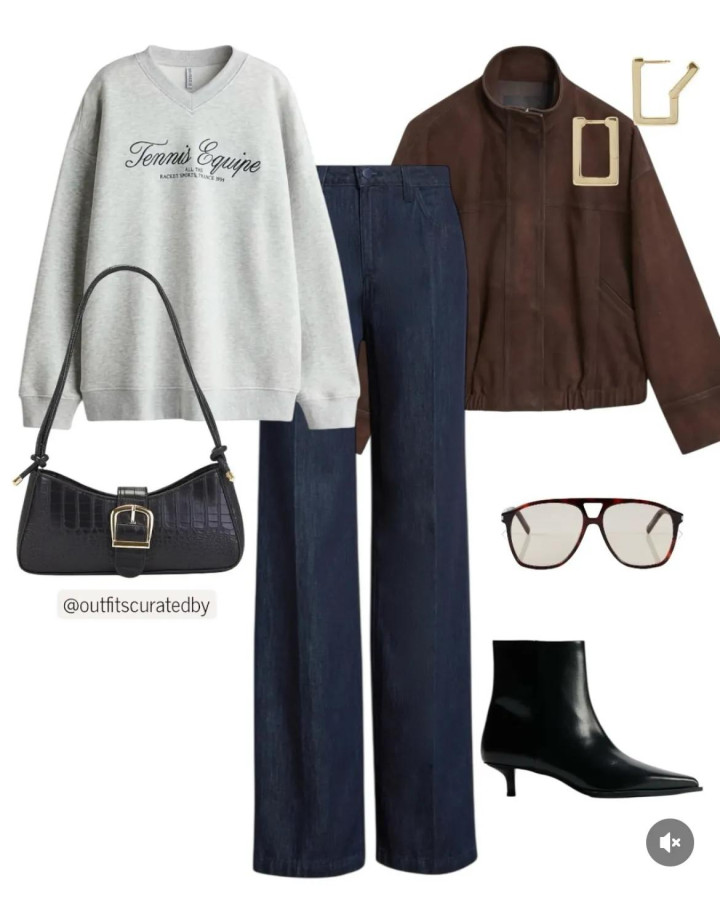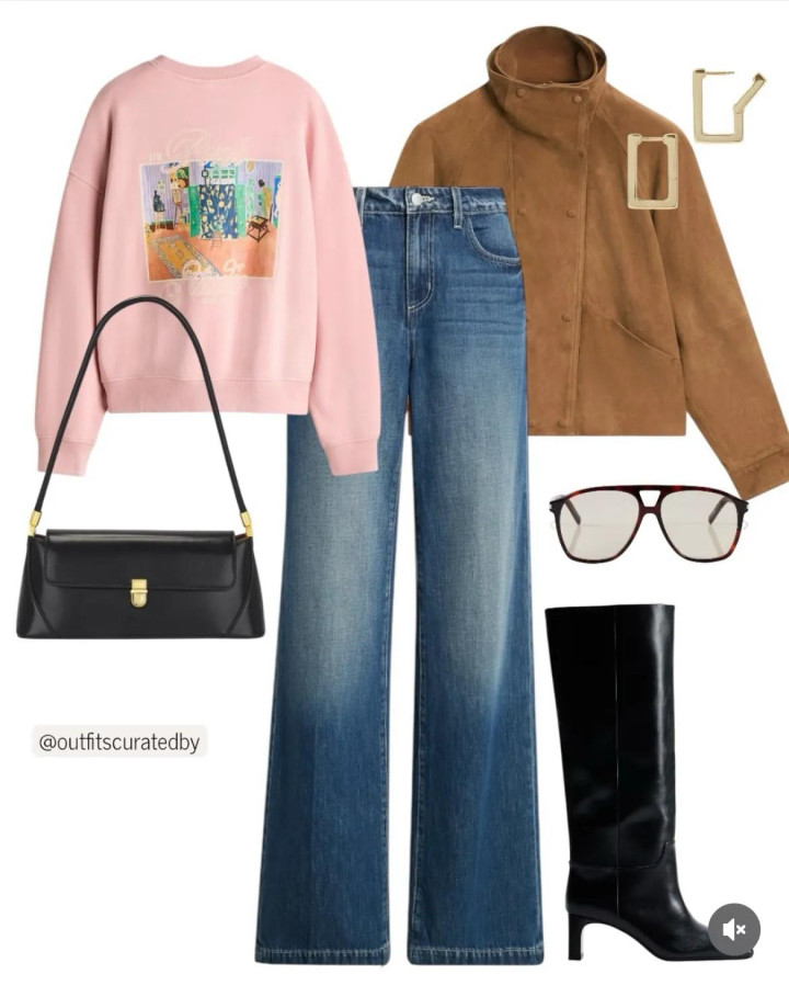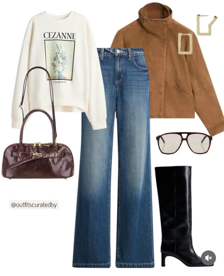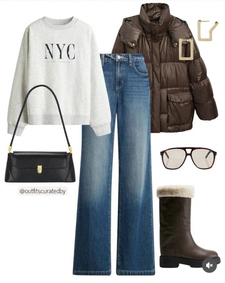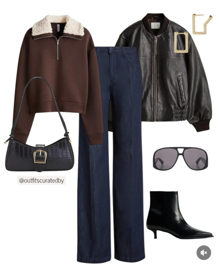 而我很爱的,是一件深巧克力色的裘皮夹克,配线条畅达的高腰喇叭裤,有了细跟脚踝靴的点缀,穿出足够不输通勤装的气质吧。
