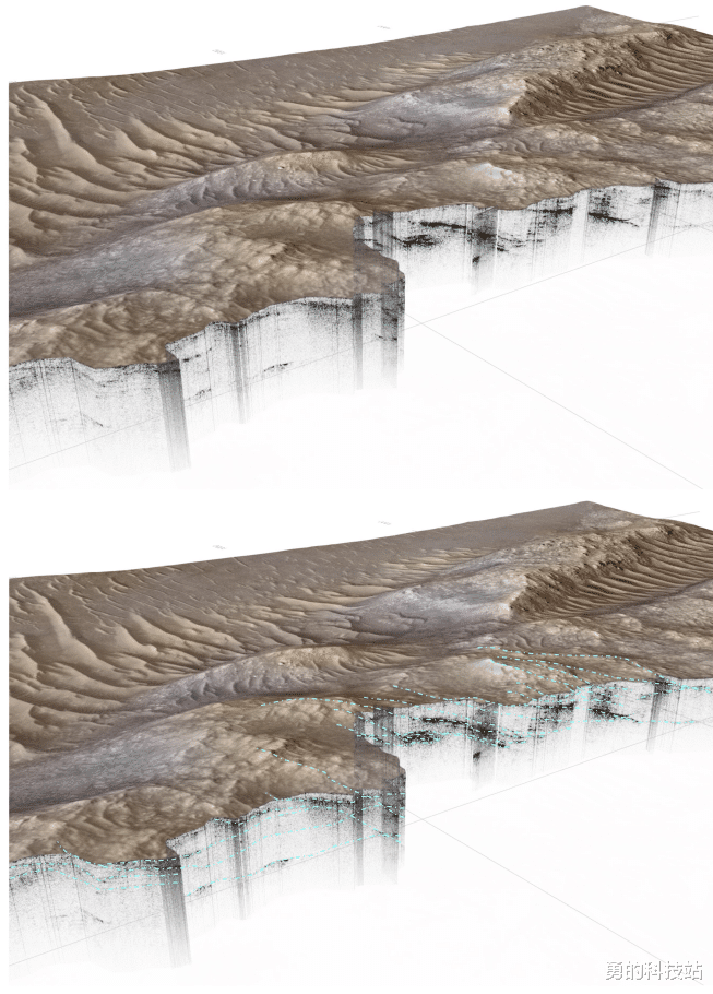在边际单位中,历害反射且名义较暗的岩层和弱反射的岩性呈现为光。投影雷达图与HiRISE数字高程模子数据一齐裸露,并从地下态状层(青色虚线)到对应的地表地形特征。图片开头:NASA/JPL/UCLA/UIO/ETH 苏黎世