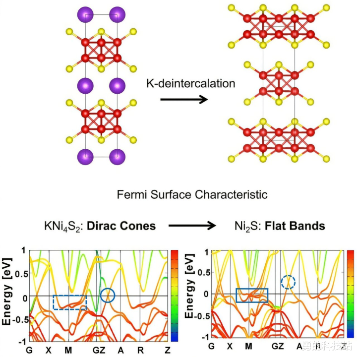 顶部:KNi4S2的结构。左图:钾原子(K)、镍原子(Ni)和硫原子(S),别离以紫色、红色和黄色暗示。右:去除K原子。底部:情状之间的过渡,高亮平坦带(方形)和狄拉克锥(圆圈)。图片开端:赵恒迪。